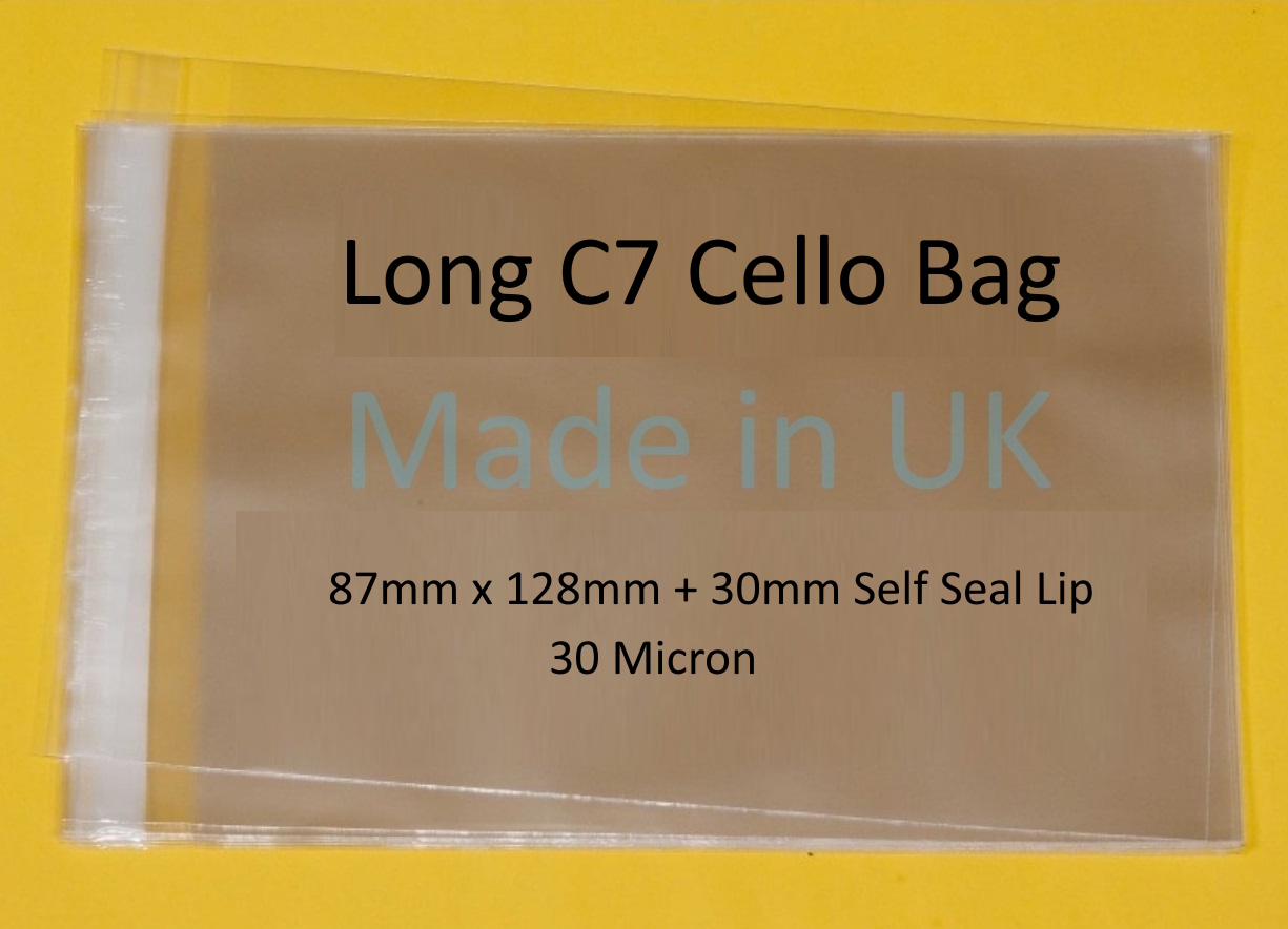 Pack of 3000 – Long C7 Cello – 87mm x 128mm + 30mm Self Seal Flap – Cellophane Display Bags 30 Micron